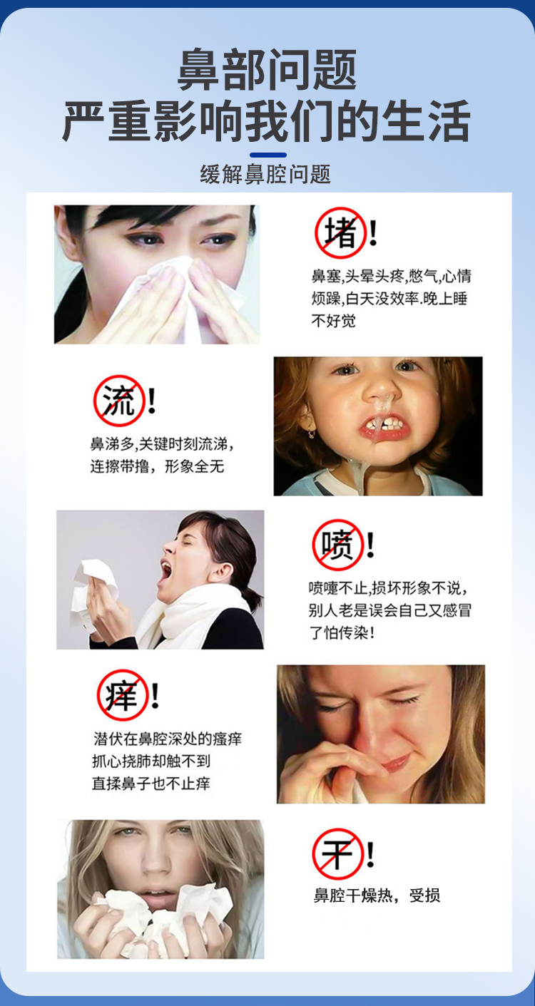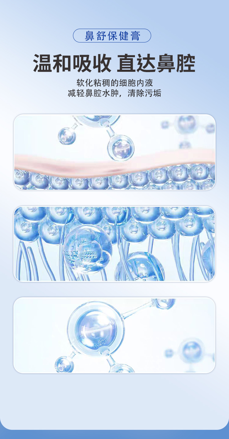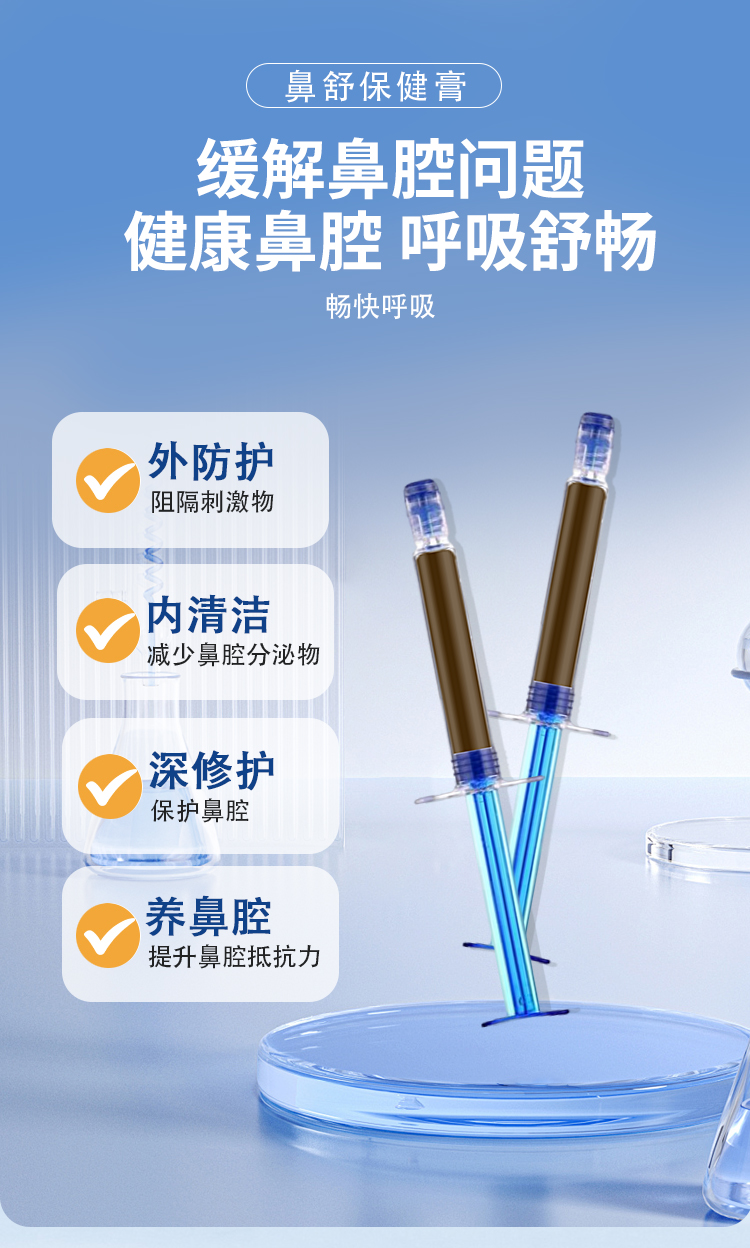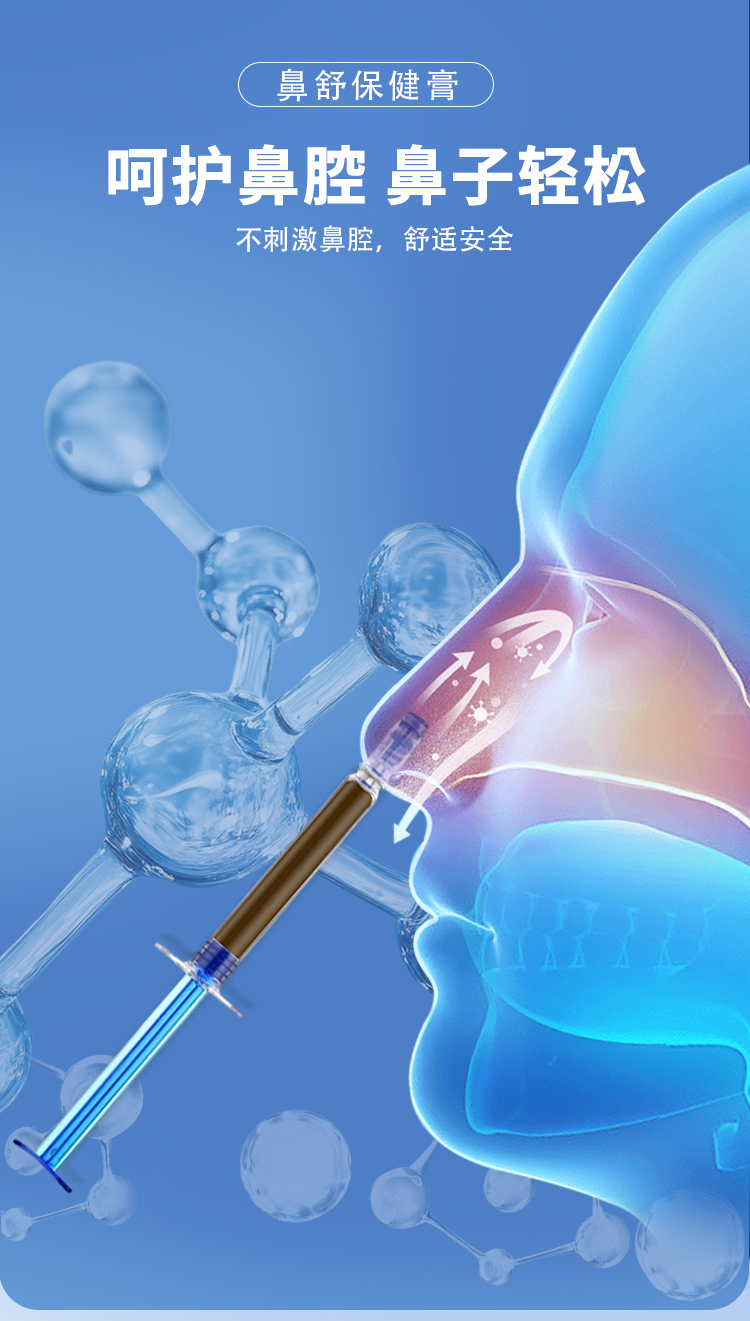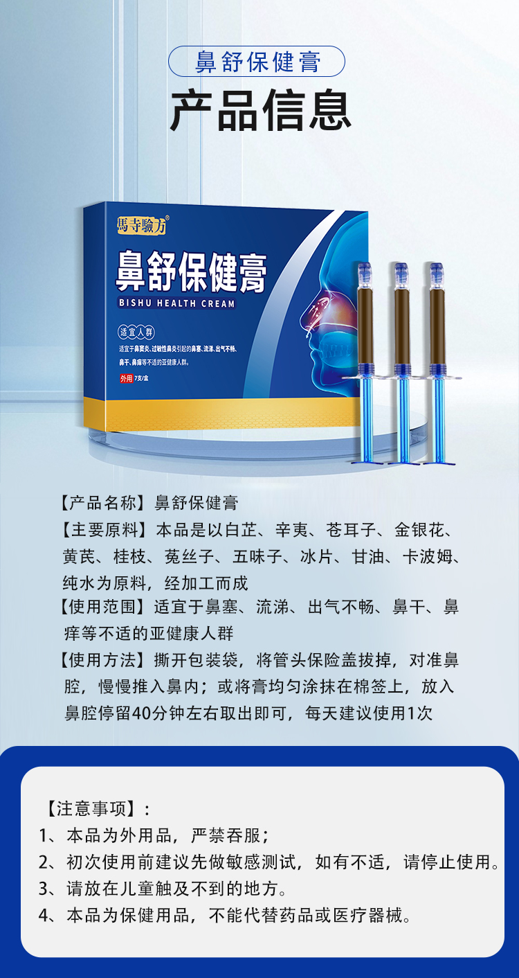 鼻舒保健膏,以草本成分為主的鼻腔護理產(chǎn)品,適用于鼻塞、鼻干、鼻癢、流涕、出氣不暢等鼻部不適,規(guī)格為7支/盒,將管頭保險蓋拔掉,對準鼻腔,慢慢推入鼻內(nèi),每天建議使用1次,源頭廠家,多樣化oem貼牌代加工。